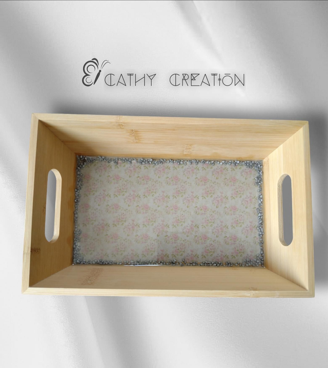 Petit plateau mêlant bois, fleurs, petits cailloux décoratifs et résine